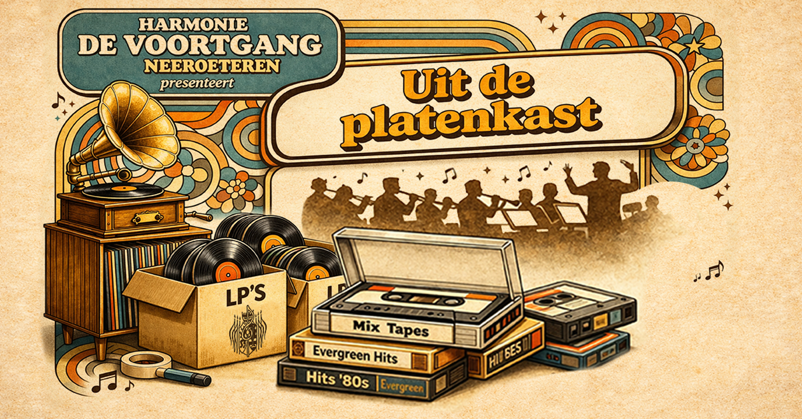 Tijdens onze Promsconcerten brengen we ‘Uit de platenkast‘: een selectie van de mooiste, meest meeslepende en meest iconische nummers die onze harmonie in huis heeft. Muziek die je spontaan doet glimlachen, een traantje laat wegpinken en misschien zelfs zachtjes mee laat zingen.